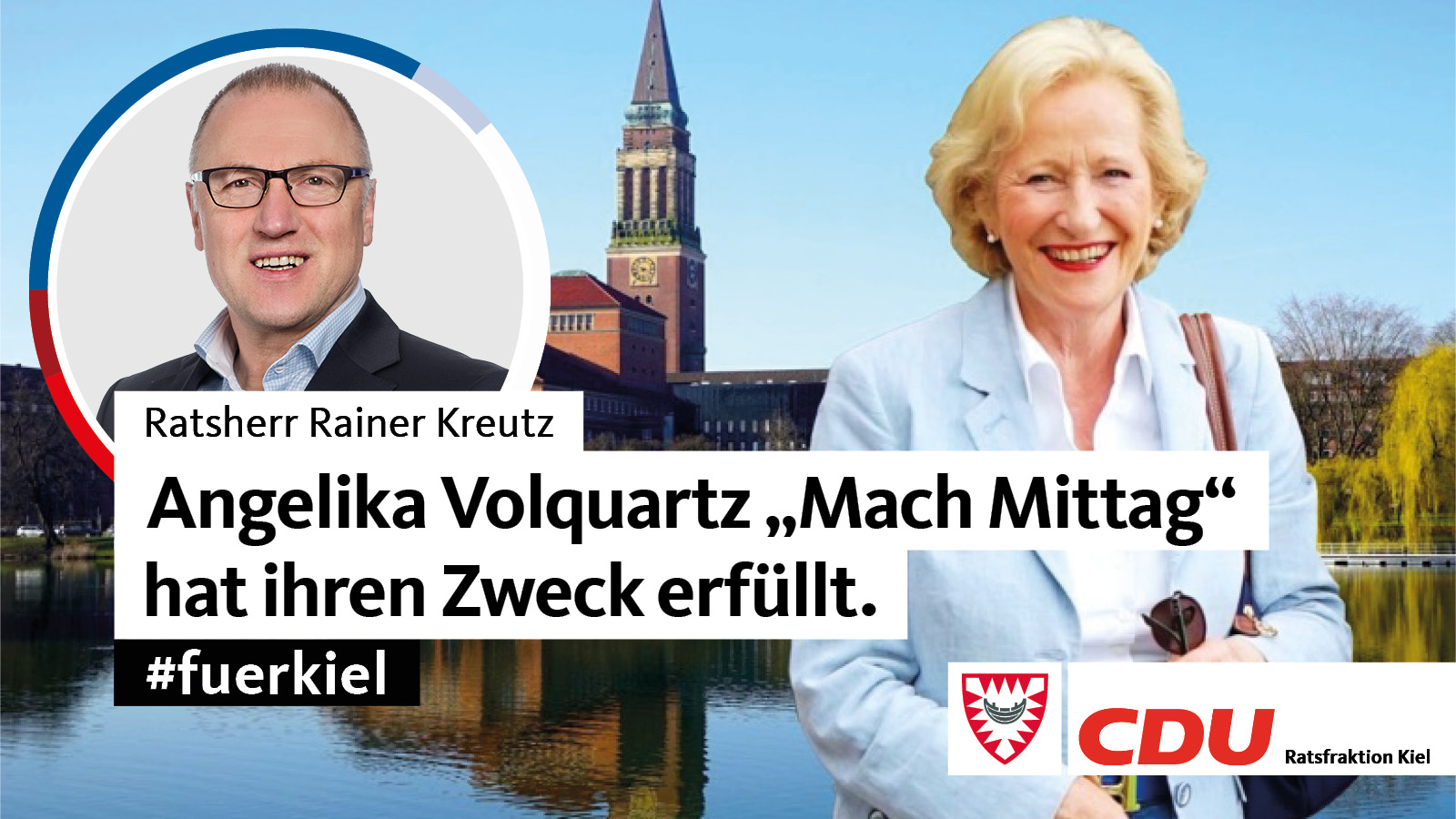 Die ehemalige Kieler Oberbürgermeisterin Angelika Volquartz (CDU) war es, die 2008 während ihrer Amtszeit die Kieler Spendenaktion „Mach Mittag“ des hiesigen Unternehmerehepaares Murmann ins Leben rief, so der Vorsitzende der CDU-Ratsfraktion, Ratsherr Rainer Kreutz.
