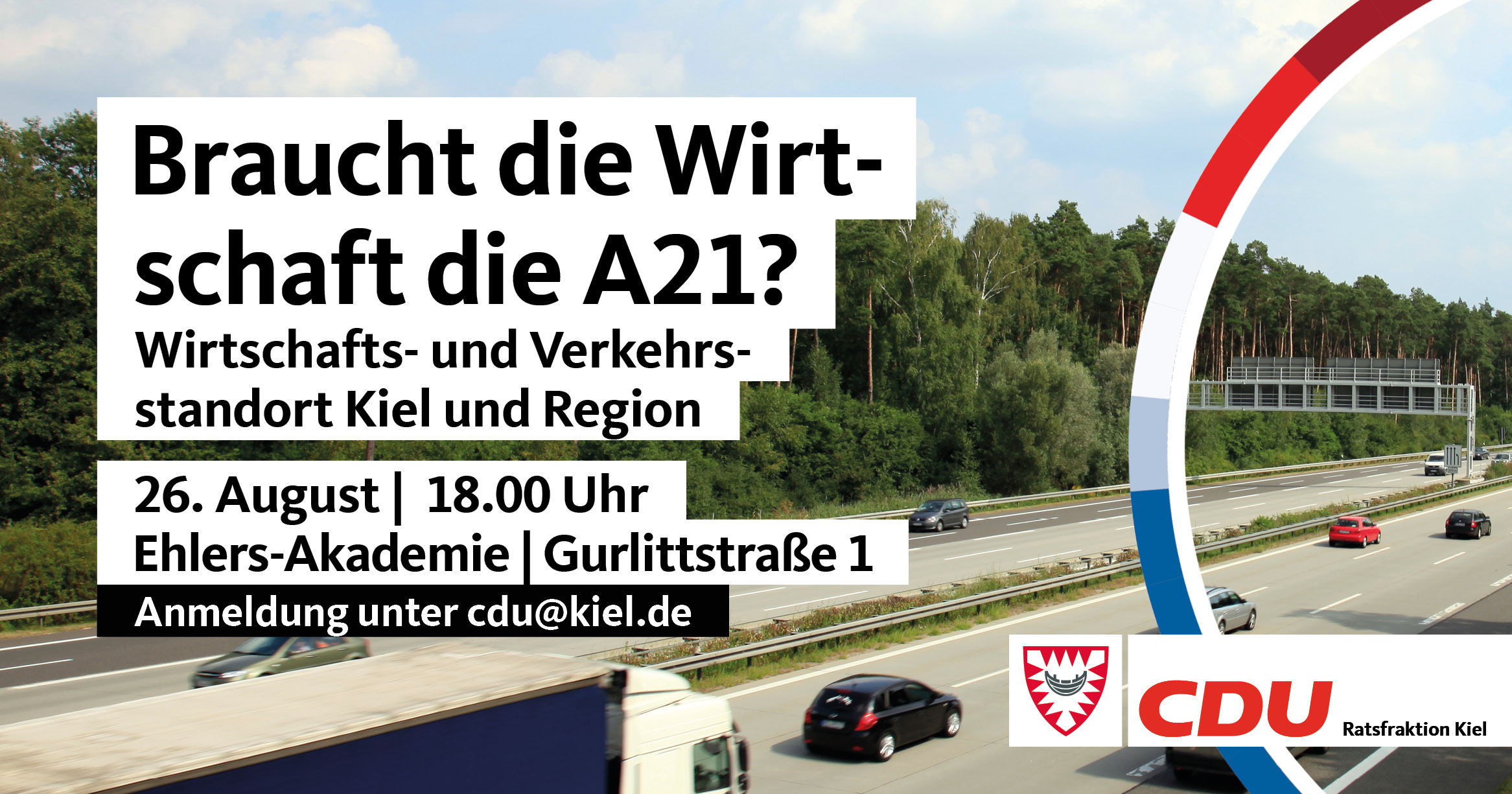Die CDU-Ratsfraktion lädt am Donnerstag, 26. August 2021, um 18.00 Uhr, in die Hermann-Ehlers-Akademie, Gurlittstraße 1, 24106 Kiel zur Podiumsdiskussion zum Thema „Braucht die Wirtschaft die A21? – Wirtschafts- und Verkehrsstandort Kiel und Region“ ein.