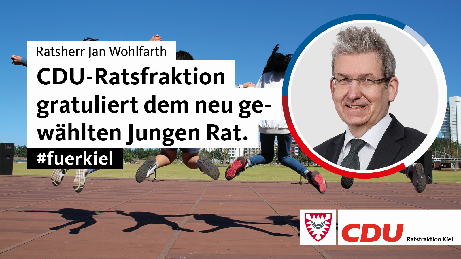 Der stellv. Vorsitzende und jugendpolitische Sprecher der CDU-Ratsfraktion, Ratsherr Jan Wohlfarth, gratuliert dem 4. Jungen Rat der Landeshauptstadt Kiel und dem Vorsitzenden, Lasse Jarno Strauß, ganz herzlich zur Wahl und wünscht allen Mitgliedern bei der Erfüllung ihrer Aufgaben stets den frischen Mut zur Durchsetzung ihrer Anregungen.