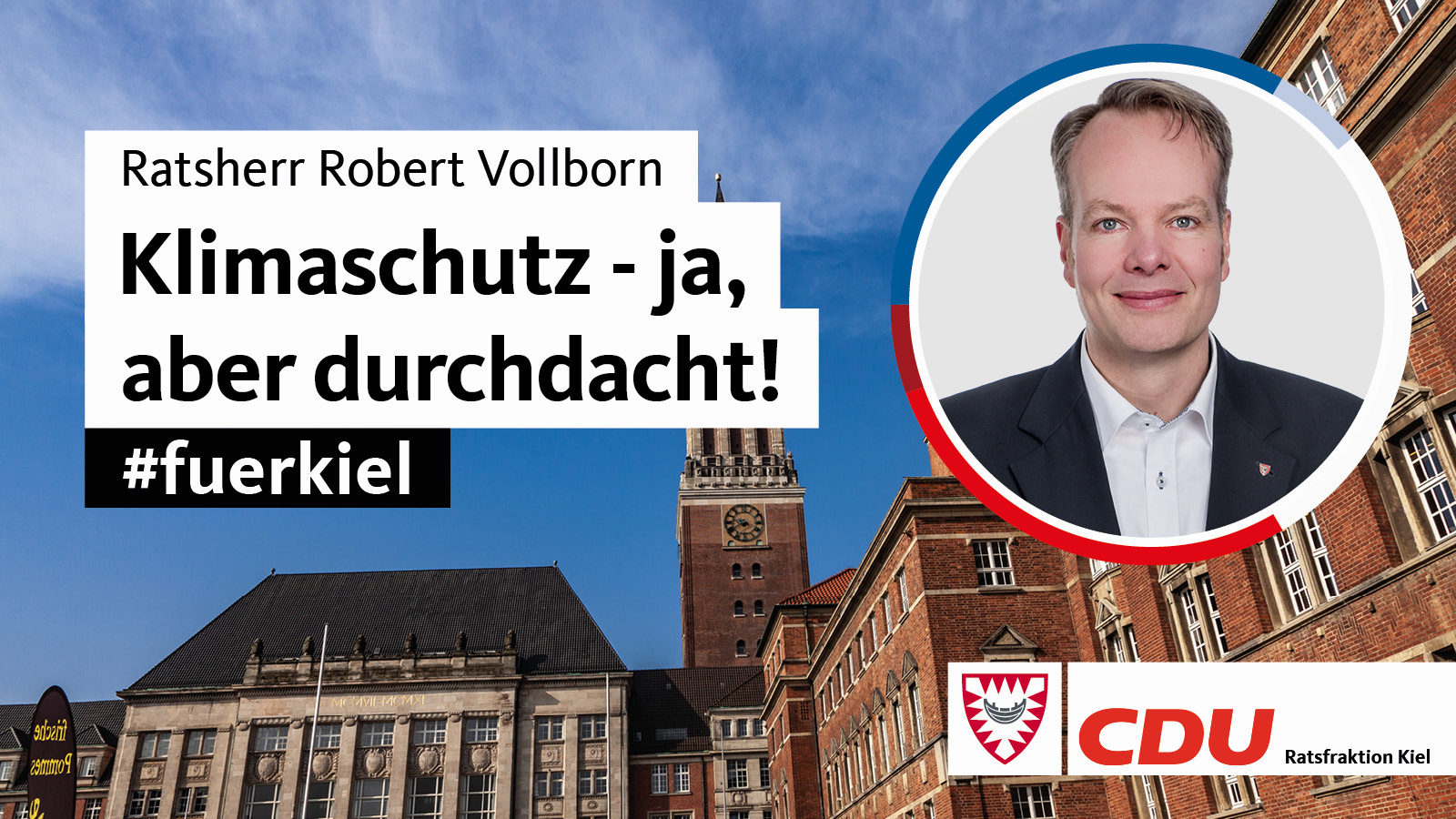 Zu der Vorlage „Positionspapier Kiel – klimaneutral 2035?!“ in der gestrigen Ratsversammlung (18.11.2021) erklärt Ratsherr Robert Vollborn, umweltpolitischer Sprecher der CDU-Ratsfraktion: Es ist gut und wichtig, dass wir uns in Kiel Gedanken über Klimaveränderungen, deren Ursachen und Gegenmaßnahmen machen. Aber wenn die im Positionspapier für Kiel vorgeschlagenen Maßnahmen jährlich 240 Millionen Euro kosten sollen, dann müssen sie durchdacht sein.