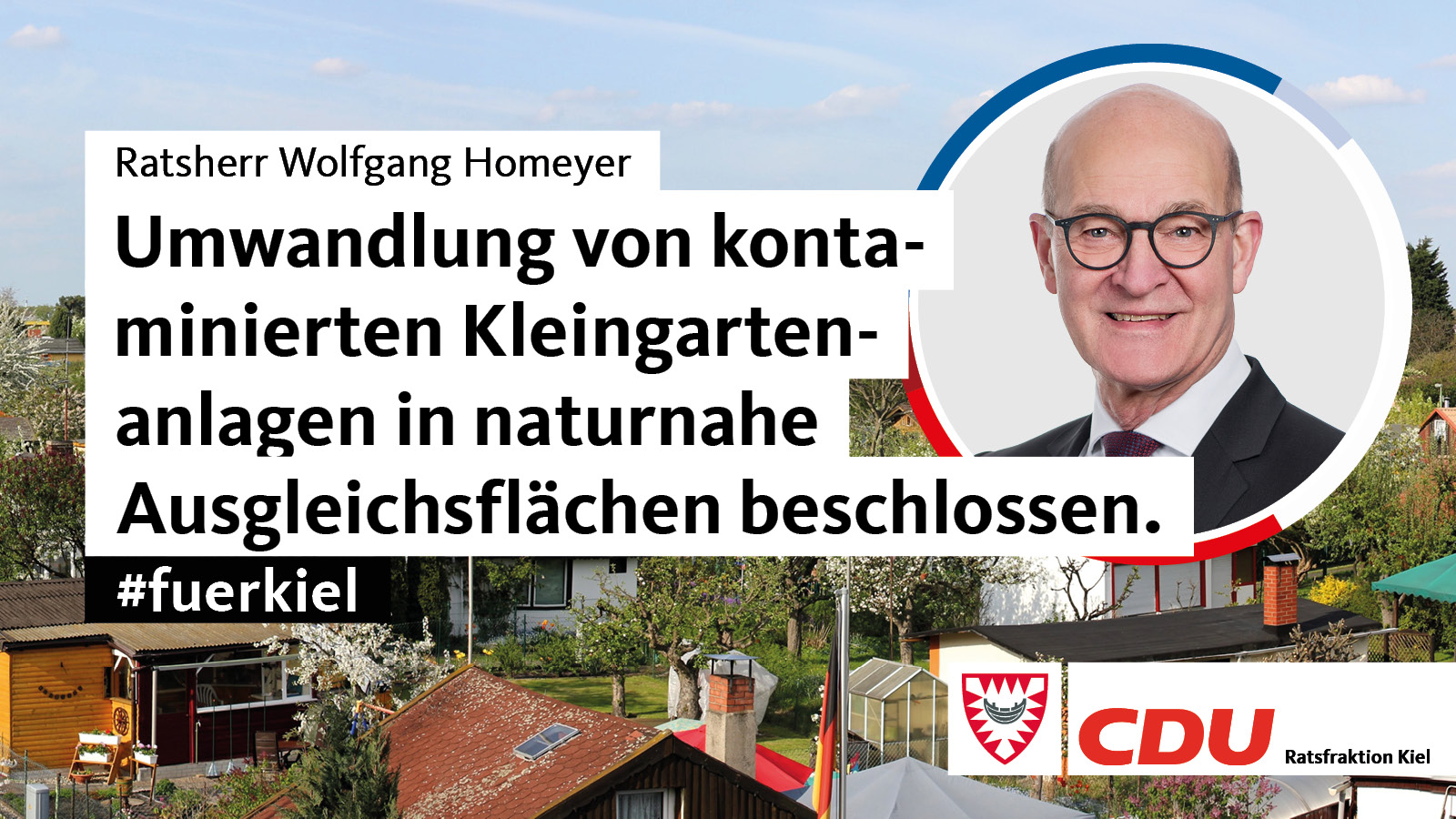 Bestätigt fühlt sich der bau- und kleingartenpolitische Sprecher der CDU-Ratsfraktion, Ratsherr Wolfgang Homeyer, über die Zustimmung zu seinem Antrag betr. der Kleingartenanlagen Baumkoppel und Hornskampkoppel I., den sowohl der SSW als auch SPD, Grüne und FDP als Antragsteller unterstützt hatten. Alle Beteiligten waren sich einig, dass man entgegen dem Vorschlag der Verwaltung, die Kleingartenanlagen Baumwegkoppel und Hornskampkoppel I unter Einhaltung aller erforderlichen Nutzungseinschränkungen zum Schutz der Pächter*innen zur weiteren Nutzung als Freizeitgärten erhalten solle, einen anderen Weg gehen muss. Das sind wir den Kieler Kleingärtnerinnen und Kleingärtnern schuldig, so Ratsherr Homeyer.