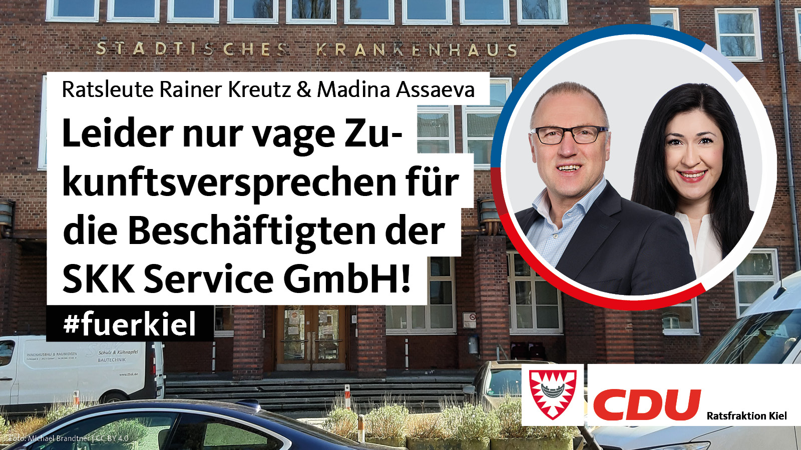 Die Ankündigung des Oberbürgermeisters Dr. Kämpfer im gestrigen Hauptausschuss, die Beschäftigten der Städtisches Krankenhaus Kiel Service GmbH (SKK Service), ab Januar 2024 in den TVÖD zu überführen ist grundsätzlich eine gute Nachricht, allerdings rechtlich nicht mehr als ein vages Versprechen, so der Vorsitzende der CDU-Ratsfraktion, Ratsherr Rainer Kreutz und die gesundheitspolitische Sprecherin der CDU-Ratsfraktion, Ratsfrau Madina Assaeva.