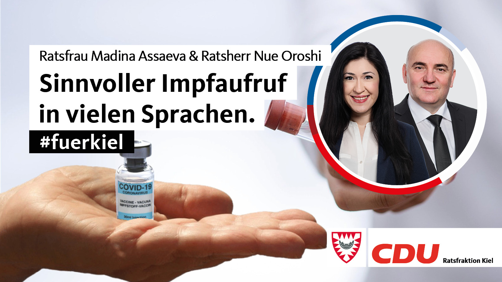 Die gesundheitspolitische Sprecherin der CDU-Ratsfraktion, Ratsfrau Madina Assaeva, und der migrationspolitische Sprecher der CDU-Ratsfraktion, Ratsherr Nue Oroshi, begrüßen ausdrücklich den Aufruf der Schleswig-Holsteinischen Innenministerin Sabine Sütterlin-Waack zu Schutzimpfungen gegen Covid-19 in verschiedenen Sprachen (Türkisch, Arabisch, Persisch, Russisch, Rumänisch, Bulgarisch, Polnisch, Dänisch, Englisch und Kurdisch).